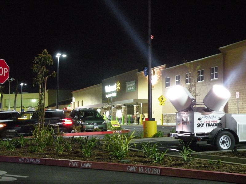 If you wish to add a touch of red carpet / Hollywood style to your crowded location, such as a downtown nightclub where sidewalk area is limited, our Sky Cannon Trailers are specially designed for this purpose. We can alter the direction of the beams to draw traffic from specific directions while also avoiding sturctures such as highrise buildings. We find that these consistently draw foot traffic for at least 6-8 blocks, and vehicular traffic can see the lights for around a mile (from the freeways when the lights are in the Gaslamp Quarter). These self-contained units use a quiet Honda gasoline generator to provide the necessary power, so your customers can be directly next to the unit without concern.